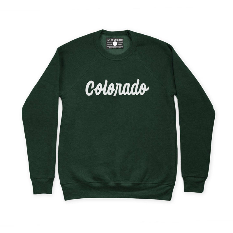 Moore Collection's Colorado Crewneck in Forest is a screen printed sweatshirt with a white waterbased ink. This soft sweatshirt is made out of 52% ringspun cotton and 48% polyester fleece. This crewneck sweatshirt has unisex sizing.
