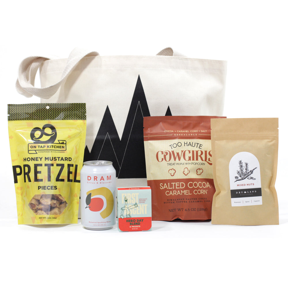 The Avalanche Tote is your perfect adventure companion, packed with a delightful mix of Colorado-made snacks that fuel your wildest explorations. Sip on a refreshing herbal sparkling water to keep your spirits high and enjoy a quick boost with instant coffee, crafted with camping in mind. All these goodies come bundled in our iconic Colorado market tote bag, ready to tag along on every hike, picnic, or spontaneous road trip.